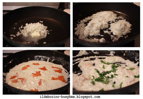Calentar la olla de agua y hervir. Preparar tus decoraciones haciendo rosas con tiras finas de salmón, lavar y secar pequeñas tapas de hojas de albahaca y cortar rodajas finas de limón. Picar la cebolla muy finamente y someras freír en la mantequilla a fuego bajo. Pasar la ricota por un tamiz y añadir a la cebolla junto con el mascarpone. Poner a hervir y bajar el fuego, añadir el salmón, dejar reducir y añadir la albahaca picada. En cuanto hierva el agua, añadir sal y cocer la pasta durante unos minutos hasta que estén al dente. Con la ayuda de pinzas de cocina de escurrir la pasta y extienda sobre una toalla.