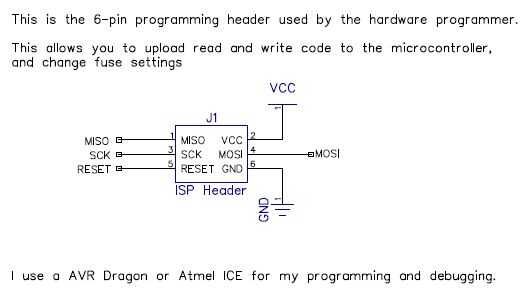 Para esta familia de procesadores Attiny, necesitamos conectar un conector para una interfaz de ISP (en el sistema de programación). Esto se nos roban algunas de las clavijas de nuestro dispositivo, pero por suerte tenemos muchos de sobra. Es un buen momento para la nota que parece haber que nada conectado al microcontrolador, excepto alambres de nombre! En esquemas, es a menudo común práctica de etiqueta de un alambre (o "red"), y dos redes se consideran conectados si comparten la misma etiqueta, incluso si no hay ningún cable explícito que se muestra. Por ejemplo, el pin 1 en el conectador de la ISP (MISO) es conectado al pin 8 sobre el ATtiny (PA5) a través de la red llamada "MISO". Las líneas de RESET, SCK y MOSI están conectadas de la misma manera.