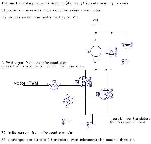 También es una buena idea añadir un diodo en el motor como se muestra - la bobina inductiva del motor puede producir un pico de voltaje cuando están apagadas. El diodo abrazaderas este voltaje y evita que se dañen otros componentes.