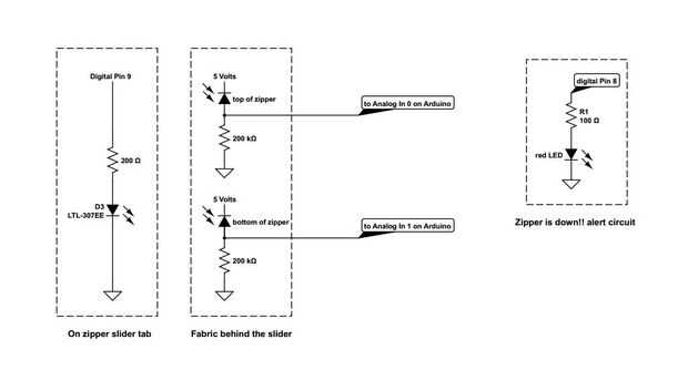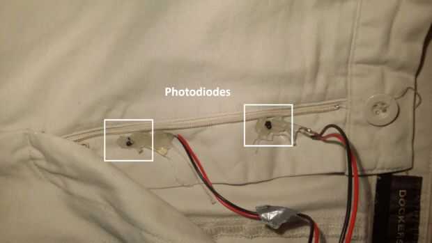 3. caliente pegue los fotodiodos en el pantalón, justo detrás de la barra deslizante. No caliente el pegamento de la cadena de la cremallera, o la cremallera se deslice hacia arriba.