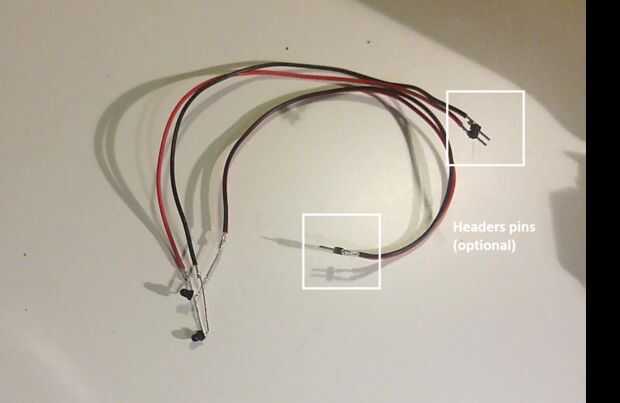 1. un gancho encima del alambre para el fotodiodo de la soldadura. El fotodiodo tiene dos cables, uno que es más largo que el otro. El cable más largo es el ánodo. El cable más corto es el cátodo. La orientación del fotodiodo es importante. Pero para ahora, suelde el cable rojo con el cable más largo y soldar el cable negro con el cable más corto. Yo también soldadas unas pinzas de encabezado a los otros extremos del cable. Esto es opcional.