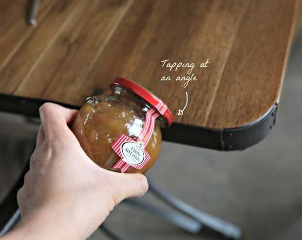 Si utiliza el borde de la mesa, sostenga el frasco en un 45' y ligeramente tap/golpeó la tapa de la jarra contra el borde de la mesa. Esto podría ayudar a aflojar las muescas de la tapa más allá de la jarra. Tenga cuidado de no a golpear el vidrio de la jarra contra la mesa, puede romper especialmente fácil en el cuello. (Sino imposible de tarro)