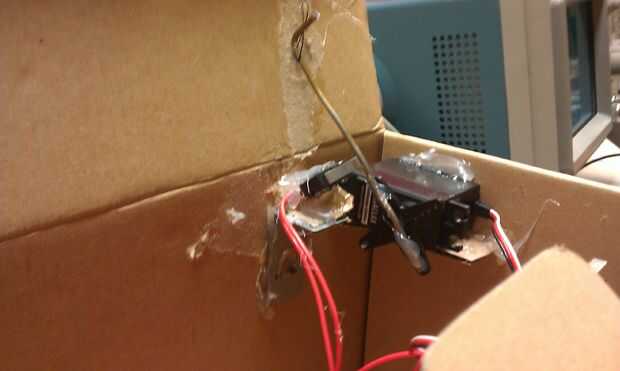 Poner el lazo del hilo alrededor del brazo de servo y sujete el hilo a la parte superior de la caja. Empuje el brazo hacia abajo con la otra mano y asegúrese de que el lugar tiene en sus manos el hilo desliza muy bien en la barra. Una vez que tengas en el lugar correcto, pegamento caliente hacia abajo. El hilo debe deslizarse libremente en el brazo. Casi hemos terminado!