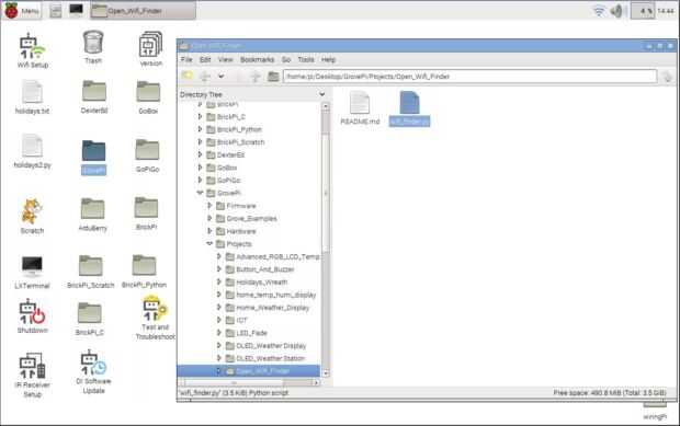 Si está ejecutando la última Raspbian de Robots, el código para este proyecto ya debe estar en la tarjeta SD. Usted encontrará en la carpeta GrovePi en el escritorio, luego proyectos, luego Open_Wifi_Finder. La ruta completa es la siguiente: