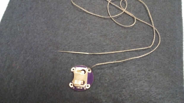 Coser uno de los terminales positivos. El hilo conductor es muy frágil, un manejo tan brusco puede romper fácilmente. Esto no es adecuado para ir en una máquina de coser.