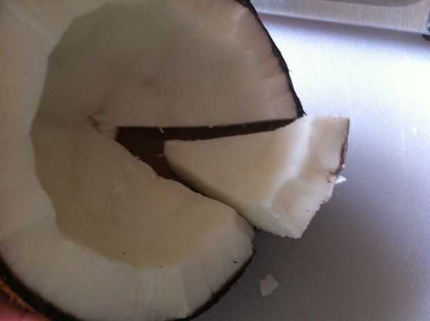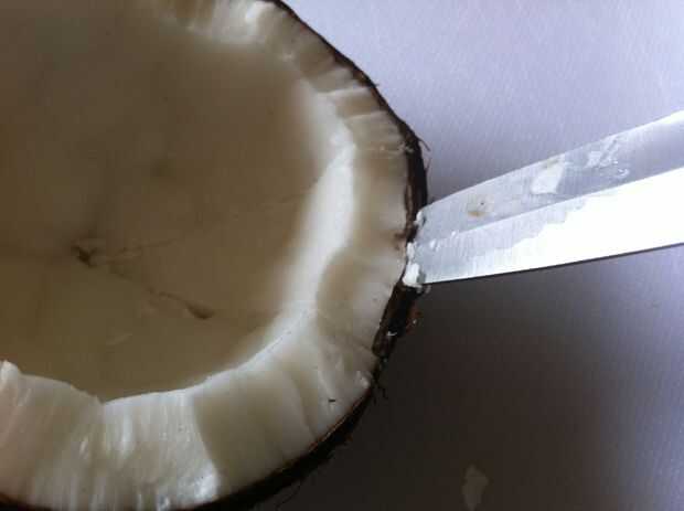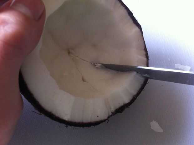 Para quitar la cáscara exterior del coco blanco necesita cortar una cuña de la carne de coco con un cuchillo más pequeño. Luego quitar la cuña con una cuchara para sacar de la cáscara. Con los bits restantes utilice la cuchara entre la cáscara y la carne blanca y va alrededor el coco haciendo palanca y debe estallar hacia fuera.