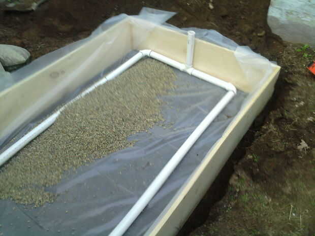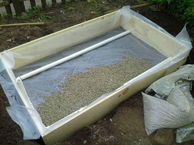 Para la prueba de nivel, puse el armazón en el agujero y utiliza un nivel en cada lado. Mina laderas un poco a la esquina trasera, al igual que el lote, para que drene el agujero del desagüe perforará en este marco (para aliviar el exceso de lluvia) en el lugar correcto. Debo haber pasado más tiempo asegurando que era nivel, pero creo que es lo suficientemente cerca. Asegúrese de que hay no hay rocas afiladas en el fondo que se perfore el revestimiento plástico, y que la guarnición plana establece mayoría en todas partes. No entro en el revestimiento durante este paso, para asegurarse de que no rasgarla.