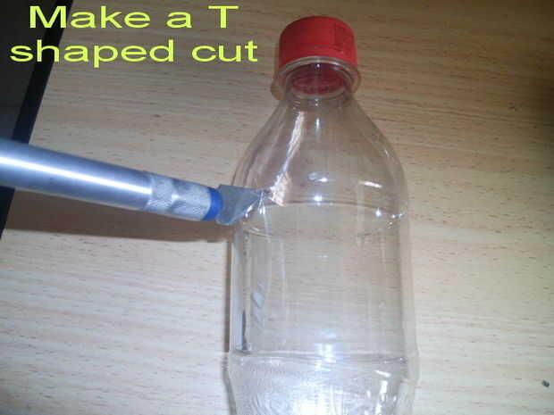Coloque el biberón en la maceta vacía y luego marcar un punto unos centímetros por debajo del nivel superior de la maceta. Cortan dos "T" en forma de agujeros en marca, en opuestos lados entre sí.