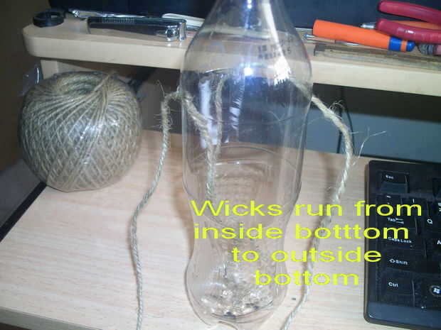 Cortar dos piezas de material wicking, cada uno ser lo suficientemente largos para llegar a la parte inferior de la botella en el interior y el exterior mientras va a través del orificio.