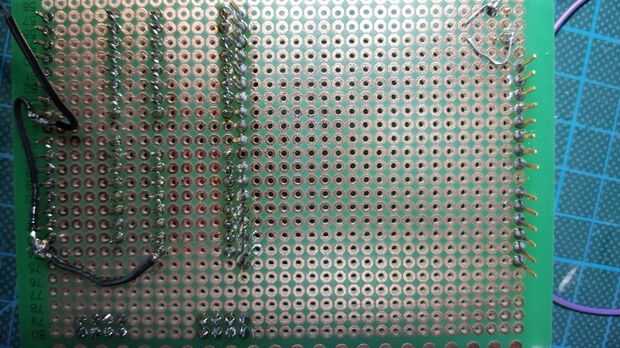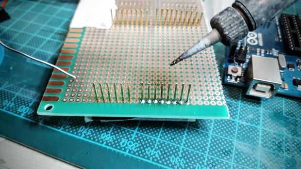 Una vez cada cosa en su lugar, cinta con cinta de enmascarar, devolver la placa y soldar los pines (Esto mantendrá tipo de constante). Un buen truco para tener las patillas soldadas directamente es soldar el pin de la primera y la última.