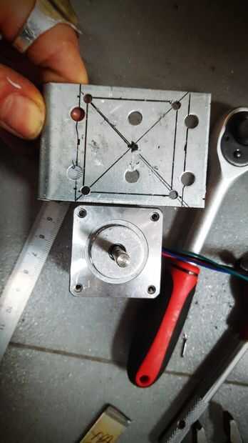 Uno de mis motores necesarios para colocarse debajo de la L, para el cepillo que tiene que mover de izquierda a derecha en vez de hacia arriba y hacia abajo. Mida cuidadosamente la distancia de los agujeros en el motor y perforar en los L. de agujeros de 3mm en los puntos que coincidan con los orificios del motor. Perfore un agujero grande del eje (tiene que ser mayor de 5mm que es el diámetro del eje). Fijar con tornillos pequeños (8mm de largo, 3mm de espesor).