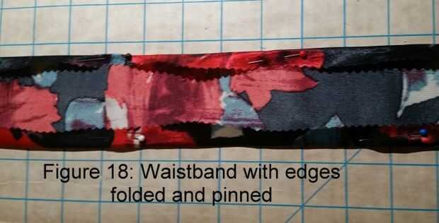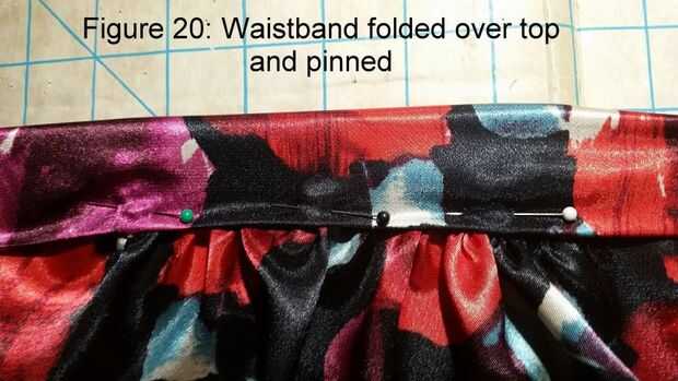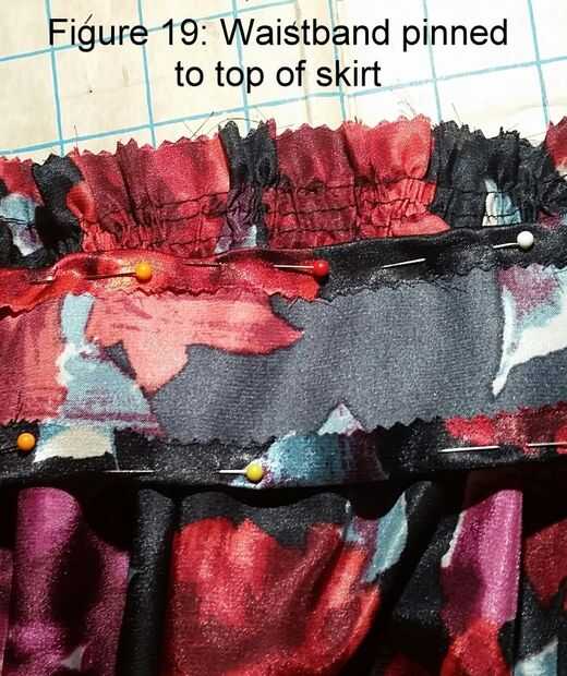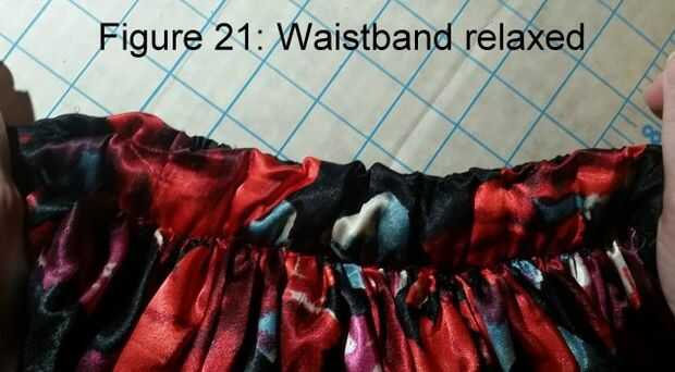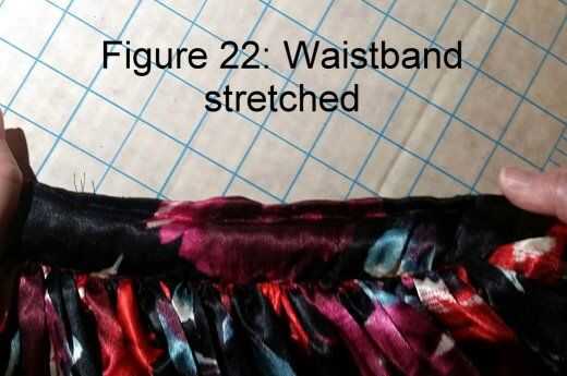 Lugar falda sobre enaguas de aros con aberturas emparejadas de nuevo. Para fijar la cintura de la tela para la pretina de la enagua de aro, empezar de nuevo desde el medio y el pin junto. Otra vez, una pulgada de cada extremo del perno. Trabajando desde el centro en alternando direcciones, estirar el elástico de la banda de enaguas de aro para montar la pretina de tela, en lugar de clavos como vas. Máquina coser a lo largo de la parte superior e inferior de la banda de tela, de ajuste en caso necesario. Ver figuras 21 y 22 que muestra la cintura estirada y relajada.