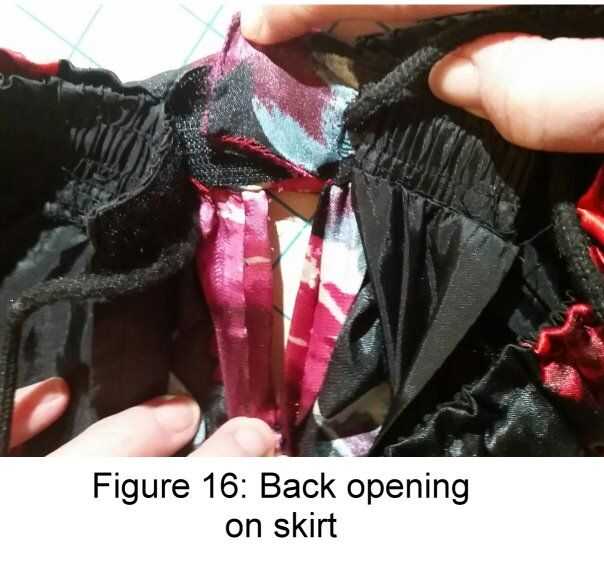 Cosa costuras de 5/8" para unirse al cuatro piezas juntas a lo largo de los 52-54 pulgadas de ancho. Dejar de costura 4 1/2 pulgadas hacia abajo de la parte superior de un panel para hacer una abertura detrás de la falda. Medir esta apertura contra la apertura en las enaguas de aros que se ajustan al tamaño de la abertura de cintura de la enagua aro. Ajustar si es necesario. Vea la figura 16. Doble, doble el material de costura en esta área y látigo puntada para formar un acabado liso para la apertura.