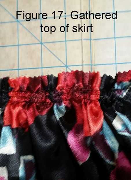 Tire con cuidado de puntadas de un lado y suavemente reunir material, deslizando la tela hacia el centro hasta que ha reunido cerca de 1/4 del material. Ahora tirar de hilos desde el lado opuesto y otra vez se reúnen aproximadamente 1/4 del material. Continuar alternando las puntas así hasta que han reunido la parte superior toda de la falda. Véase la figura 17.
