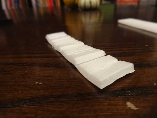 Tomar una tira de tablero de la espuma y quitar un lado del papel de la Junta. Luego realizar cortes en la tira (sin cortar a través de todo el camino). Ruede para arriba y péguelo.