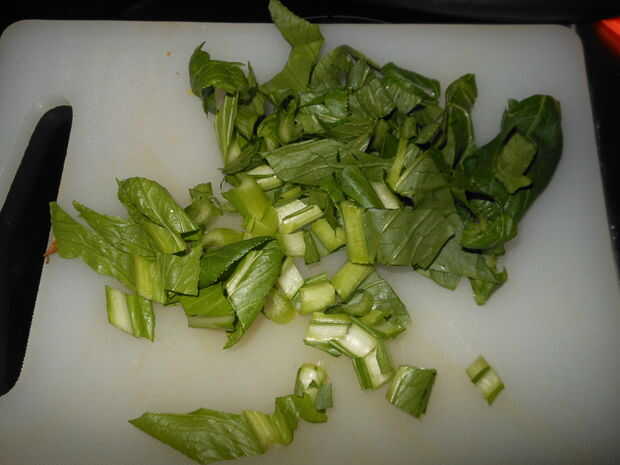 3) agarrar un manojo de su suma de Choy y lavar, cortar los extremos y descartar luego desmenuzar la materia frondosa y de tallo, también añadir esto a la taza que se deja de lado.