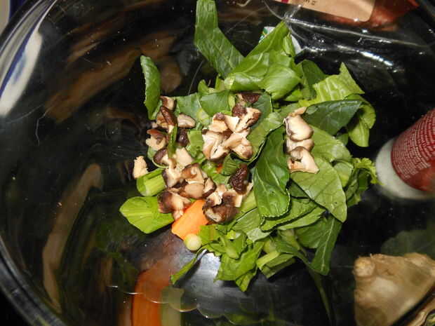 4) tomar 3 de tu shitake de la impregnación líquida (su que ha 30 minutos por ahora) y picar también aproximadamente añadir esto a la taza.