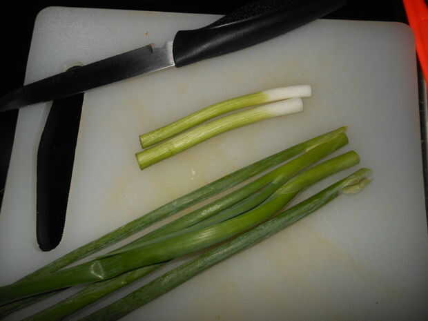 2) picar la cebolla por la mitad y ponga el extremo verde a un lado para más tarde, utilizará esto para vestir el ramen. Picar la cebolla aproximadamente y añadir en el bol con el ajo etc..