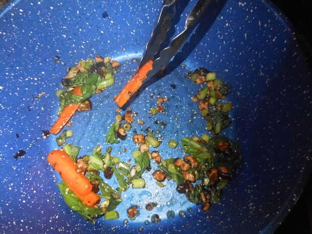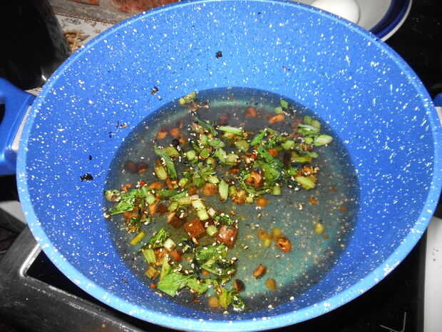 Dejando el aceite y la grasa en la olla, añadir sobre otra cucharadita de aceite y poner en su taza de te veges establecer aparte anterior (suma de Choy, jengibre, ajo etc.) Esto fríe hasta que la suma de Choy es blando y las hierbas aromáticas.