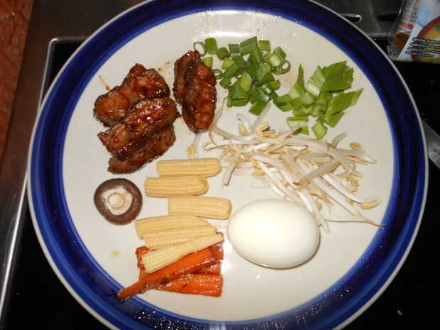 Dados sus cabos de cebolla verde, sacar un puñado de brotes de soja, cortar el elote lanzas por la mitad y pelar el huevo y cortarlo por la mitad. Corte que una pequeña cantidad de suma de Choy ligeramente y esperemos que en este momento te deja debe tener todos los ingredientes como se muestra en la imagen. No se olvide de la sal y pimienta el huevo :D