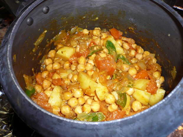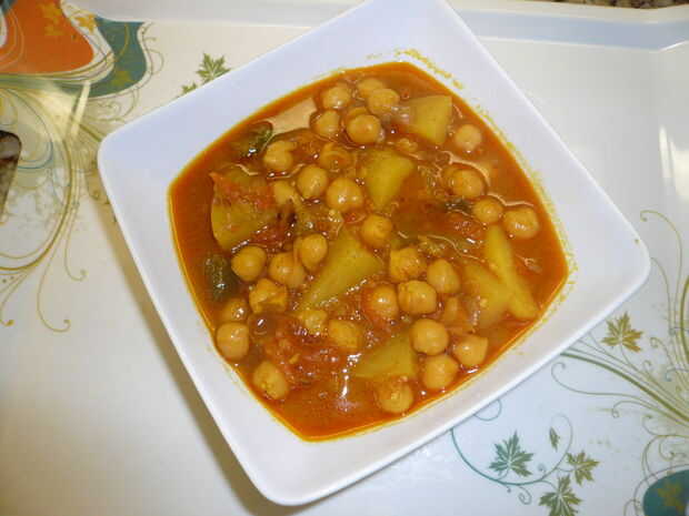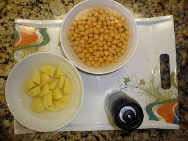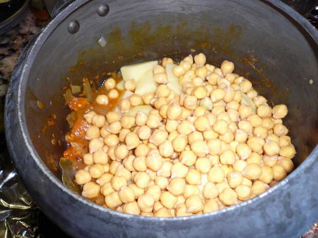 Si uso olla para cocinar utilice los garbanzos enlatados. Escurrir y lavar los garbanzos. Garbanzos enlatados se cocinan más rápido. Cocinar en la olla cubierto hasta los garbanzos y patatas son suaves.