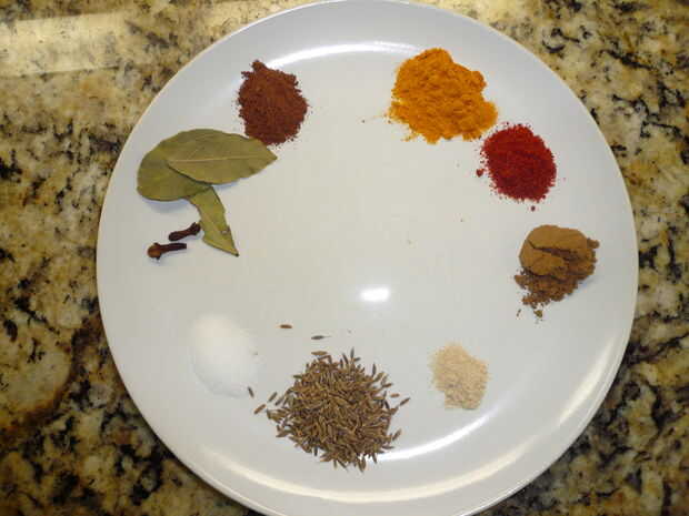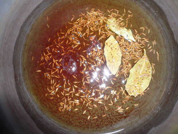 Cuando se está caliente el aceite agregue asafétida, semillas de comino, clavo, laurel y ramita de canela. Agregue y mezcle durante un segundo.
