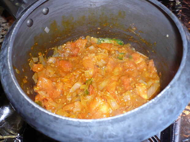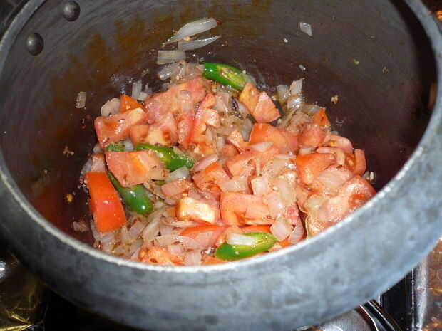 * Añadir el tomate picado, chiles verdes, polvo de Chile rojo, polvo de la cúrcuma, comino y cocinar por 2 minutos