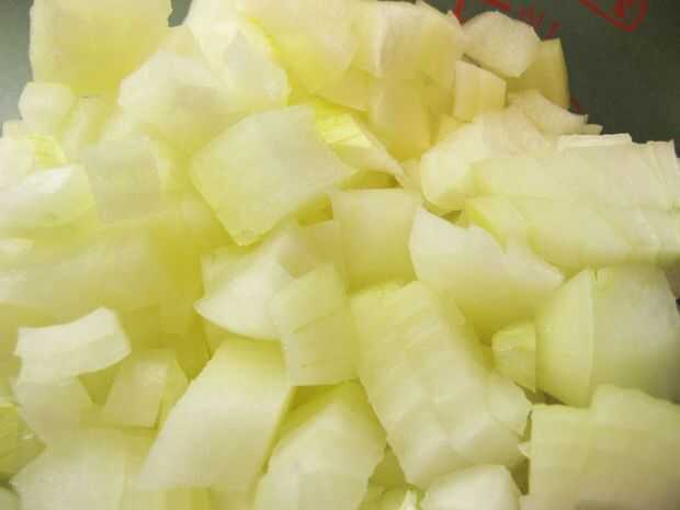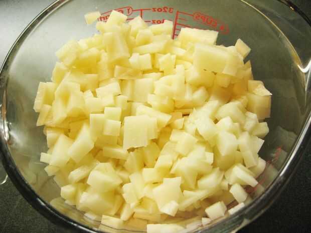 Piel y dados las patatas - intento hacer mis piezas alrededor 1/4" en cubos. Tratar de terminar con alrededor de 6 tazas y ponerlas en un bol grande cubierto de agua.