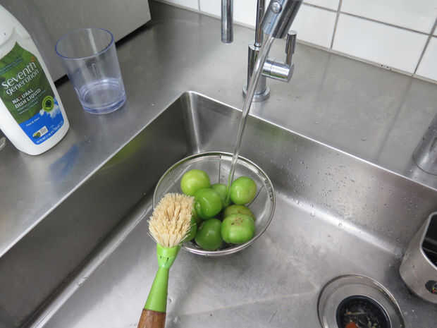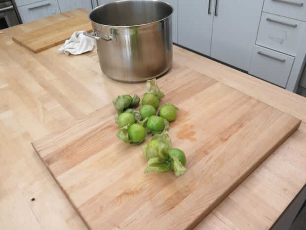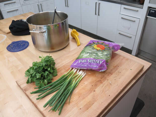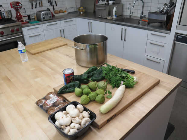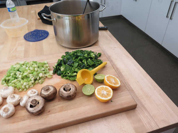 Hongos, rábano daikon, tomatillos, chiles pasilla y perejil italiano. Para los tomatillos, quisiera friegue un poco después de pelarlos. Cortar todo en tamaños que tenga sentido para usted. Limón y Lima. Por último, agregaré algunas cebollas verdes y espinaca.