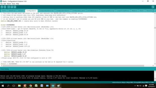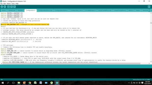 Ahora toma esos valores y abrir fichero config.h en el software de Arduino. Línea "#endif / / PIDTEMPBED". Sobre ella encontrarás tres no comentada (no "/ /" al principio de la línea) líneas que comienzan con "#define". Tomar los valores Marlin te dio y ponerlos en el archivo config.h respectivamente; KP -> bedKp, Ki -> bedKi, Kd -> bedKd
