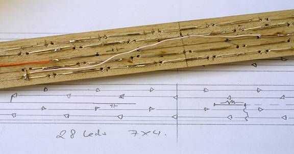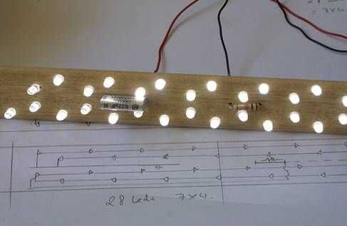 «Soktha de Francia (soktha me envió su versión de este circuito, el uso de dos cuerdas de 14, para un total de 28 LEDs blancos. Él montó los LEDs en un palo de madera. Cuando se enciende de una fuente de 240 v CA de 50 Hz, los dispositivos proporcionan una agradable luz blanca.
