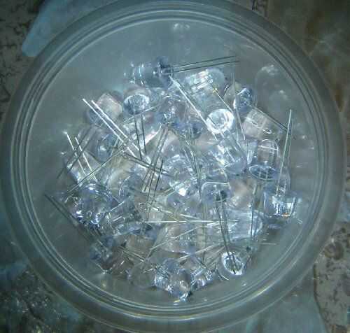 Un montón de LEDs, me compré un paquete de 100 en ebay (JELED Electronic Co Ltd, Hong Kong) para cerca de $20. Estos son los LEDs de 10mm, blanco Jumbo, 140, 000mcd (confundiendo unidades de luz) y 20 mA. Acaba de obtener un montón de los más brillantes que se puede encontrar. Yo 60, pero la próxima vez puedo usar 100 todas enfocadas a diferentes distancias focales. Éstos también vinieron con 100 juego de resistencias (que no requieren estos aquí).