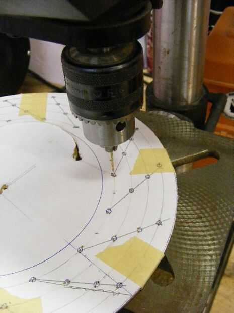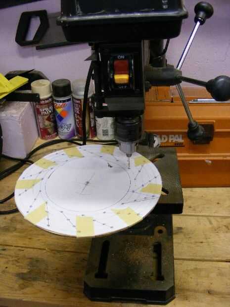 Luego use un taladro (una prensa del taladro es grande aquí) para hacer 2 agujeros por el LED. Realizar los orificios donde cada pequeño círculo cruza las líneas del círculo grande para que el LED puede ajustarse o para dirigir la luz para el foco cerca de la lente.