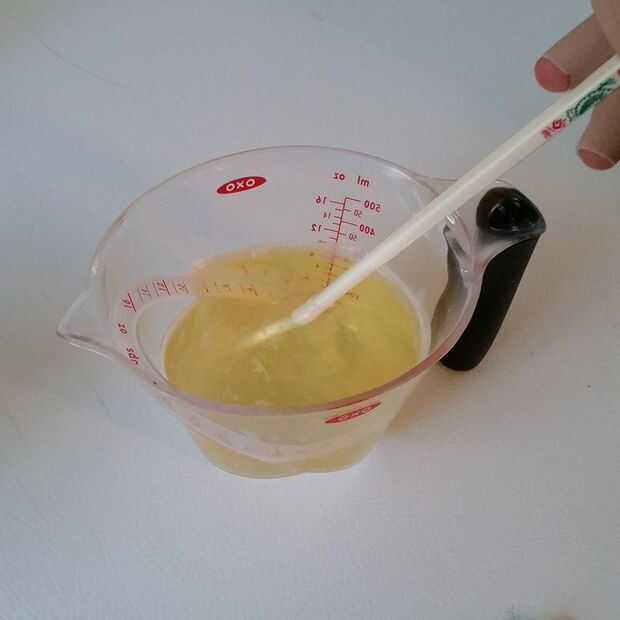Séptimo, cuando la cera se derrita completamente, apagar el fuego y con cuidado utilizar un guante de horno (o algo parecido) para verter la cera caliente en la taza de medición con el aceite de nuez calentado. Agitar la mezcla durante unos minutos hasta que se ve todo del mismo color.