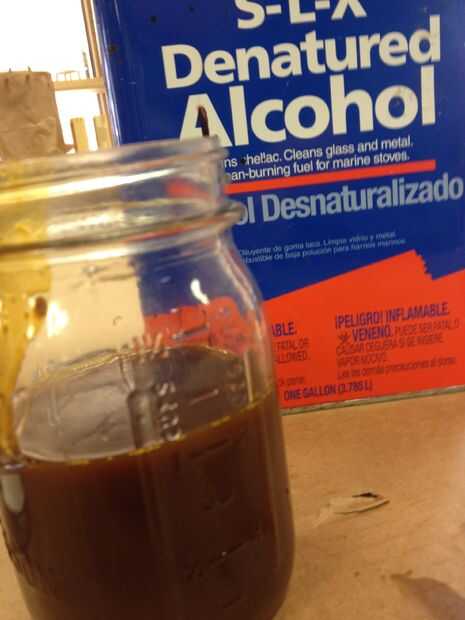Yo uso una mezcla de uno a uno de goma laca y Alcohol desnaturalizado. La mezcla de uno a uno no tiene que ser perfecto, siempre y cuando cierre. Cuando se utiliza la parte uno a uno la mezcla, tienes que aplicar más capas pero usted conseguirá un mejor acabado al final. Y no tienes que lijar tanto entre capas.
