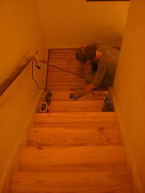 Nota importante: se dará cuenta de que no utilice nunca un grano de lija más fino de 60 en este proyecto... Mayoría de los sitios DIY y el contenedor de poli y el recipiente de tinción dijo que hicieran un grano áspero primero y luego ir sobre la madera con grano 100 o 120. El chico de la tienda de hardware incluso recomienda 180. Pero aquí es la cosa: todos en mi casa ha caído por mis escaleras. Estaban muy resbaladizas. En los dos años que nos hemos propiedad de la casa, incluso hemos considerado arena de pintura en las escaleras, como lo hace en las escaleras de mampostería exterior. Así que en les acabado, dejo sólo la textura de la madera permanecen. Nadie va a querer diapositiva "arriesgada" a través de las escaleras en su ropa interior, de todos modos. Ahora es una ligera rugosidad para los pasos. Hay una foto hacia el final. Esto puede significar que deben rehacer otra vez en 10 años en lugar de 30. Pero tal vez no se romperá una pierna entre ahora y entonces, y que merece la pena, en mi humilde opinión.