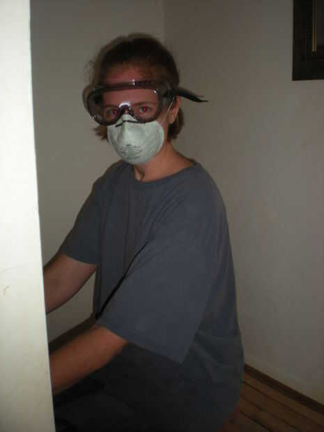 No pintura de plomo, pero todavía era un ruidoso y sucio negocio. Gafas de seguridad, una máscara de polvo que he tenido que cambiar varias veces, y tapones para los oídos eran necesarios. En día lija #2, he añadido un pañuelo para mi pelo.