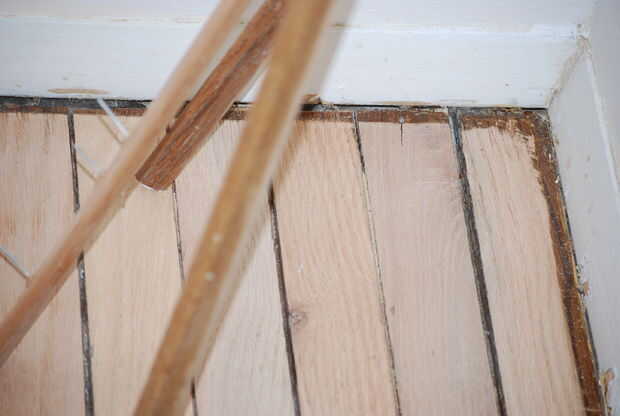 Antes de empezar, decidí levantar la pequeña frontera ribete alrededor del aterrizaje que nunca nadie había molestado a pintar. Hizo llegar a los bordes mucho más fácil. Me había preocupado aquel color oscuro ribete el aterrizaje siempre se vería sucia. Había iniciado en el borde del borde y golpeado ligeramente un destornillador (con un martillo) primero detrás y entonces debajo de la frontera, lentamente trabajando suelto. Antes de reemplazarlo, lo pinto lo mismo blanco que voy a pintar el resto de la guarnición.