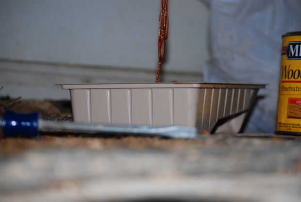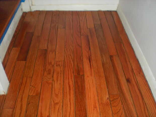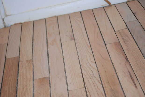 En las fotos aquí, puede ver los huecos grandes, desiguales en el piso viejo. A continuación, ver el suelo manchado con la cuerda teñida en lugar. Luego ves el piso acabado, polyurethaned. El color del piso y el color de la cuerda son muy similares después de ser polyed. Todavía hay un par de pequeñas lagunas, pero creo que se ve muy bien. Era un cierto encanto a ella.