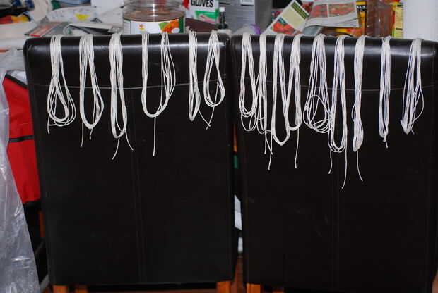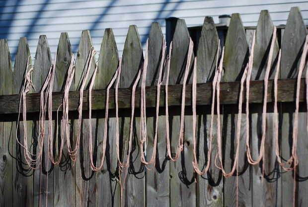 En tercer lugar, cortar tiras de hilo de algodón. Para espacios de fila 15, corté once pedazos largos de 8 pies y cuatro piezas largas de 12 pies. Yo les sumergió en la mancha utilizaría en la madera y colgado afuera de la cerca que seque durante la noche. Nos preocupaba consiguen tiesos, pero no se refuerza en todo en la mañana.