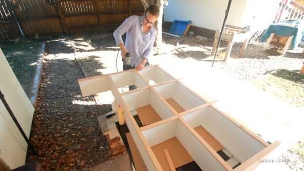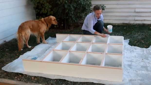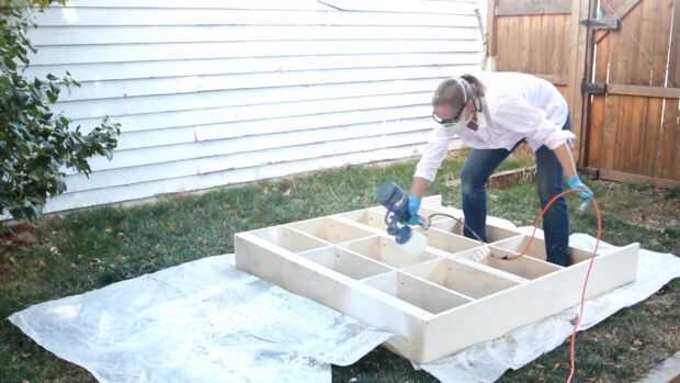 Ahora tenemos la unidad del estante superior y estoy pintando lo blanco, pulverización que es mucho más rápido. Luego lijar después de la primera capa. Estoy usando drywall spackle otra vez para rellenar los agujeros de bolsada, que hace mucho para terminar la pieza.