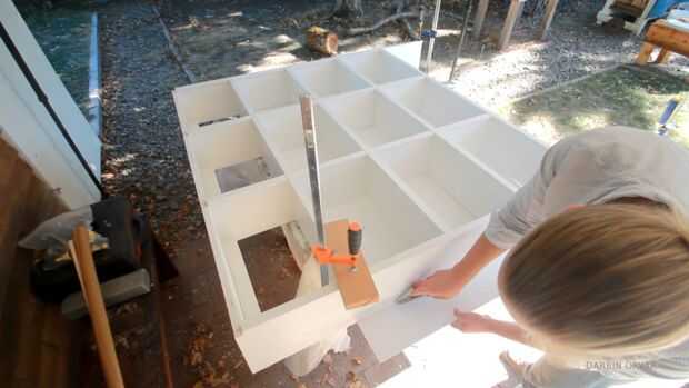 OK, ahora vamos a centrarse en el apoyo. Decidí ir con madera que pintado de blanco también. Por supuesto podido con beadboard aquí, pero quería una superficie simple lisa agradable. Simplemente anotar tamaño y luego clavado en de la parte posterior. Tuve que cortar la madera prensada en la tienda, ya que no podía mover una hoja toda completa en mi coche, por lo que tengo que hacer un poco juntar las piezas juntas en la parte superior. Pero si conectas las piezas en la parte posterior de un estante no ves nada en la parte delantera.