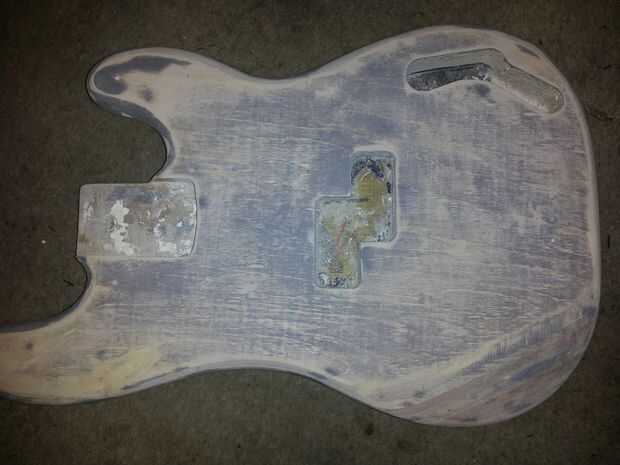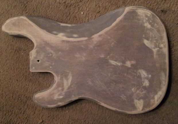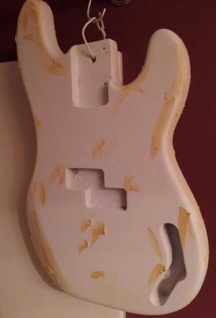 Usé blanco Rustoleum primer puesto que iba a terminar el bajo en amarillo. Poner en una fina capa, deje que se seque completamente y enarenó ligeramente con papel de lija 400. Se puede ver en la última foto donde aplicó en masilla para madera para limpiar asperezas y gubias.