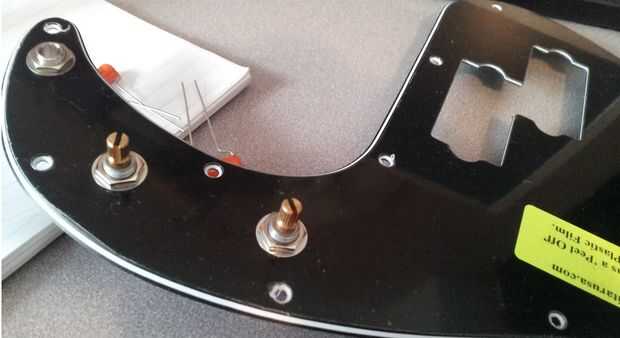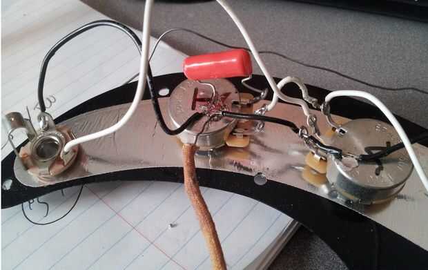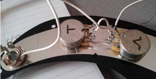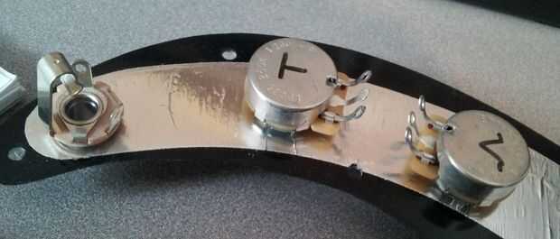Los cables de recolección fueron alimentados a través del orificio en el cuerpo y eran soldadas. La guardia de la selección fue luego atornillar. Tuve que taladrar unos agujeros como el pick guard no era un ajuste exacto al original, además me había llenado en los agujeros originales cuando agregué relleno de madera en el cuerpo.