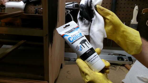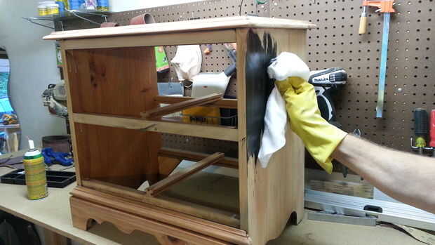 La tinción es bastante recta hacia adelante. Usé un paño sobre la mancha que sólo requiere de un paño limpio para aplicar. Te sugiero altamente guantes! Simplemente aplique una gota de tinte a la madera y limpie en la dirección del grano. Yo no he utilizado este tipo de mancha antes, pero estaba muy contenta con los resultados.