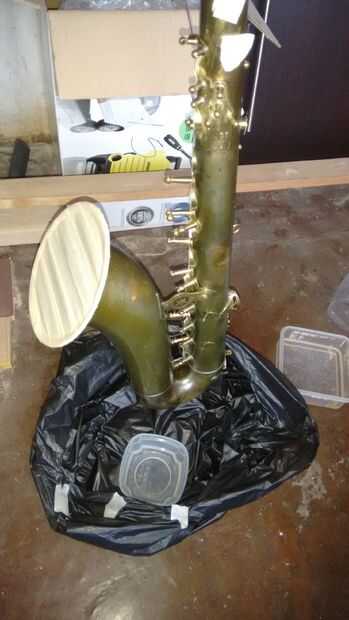 • dentro de una bolsa colocar uno o dos plásticos contenedores abiertos con vinagre y cierre la bolsa hermética con saxofón dentro. (más sobre esto consulte el paso 1 en el cuello)
