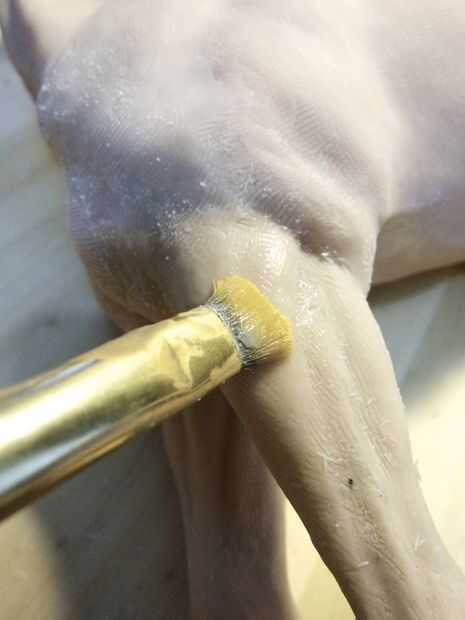 I vierte una cantidad muy pequeña de aceite de bebé (sólo unas gotas) en un vaso de plástico pequeño y sumerja un cepillo viejo robusto (éste especialmente he cortado las cerdas hasta un borde plano, ancho) y, de manera rayada similar a las herramientas de rastrillo, suavizar las marcas de sus formas. Utilizar con moderación el aceite para bebé - si usted consigue demasiado mano dura con ella, efectivamente pueden acabar con todo el trabajo de detalle que has hecho. Funciona por el reblandecimiento de la arcilla (también puede Agregar una gota o dos de arcilla dura, para ablandarlo intencionalmente) pero si se llega a ser demasiado en la arcilla o en la superficie, puede llegar a ser un desastre sucio, pegajoso. Pecar de menos y depende más de las pinceladas para equilibrar las cosas. También me gusta tocar mis dedos sobre la superficie al final, también en un patrón de superposición, para mezclar a las pinceladas.