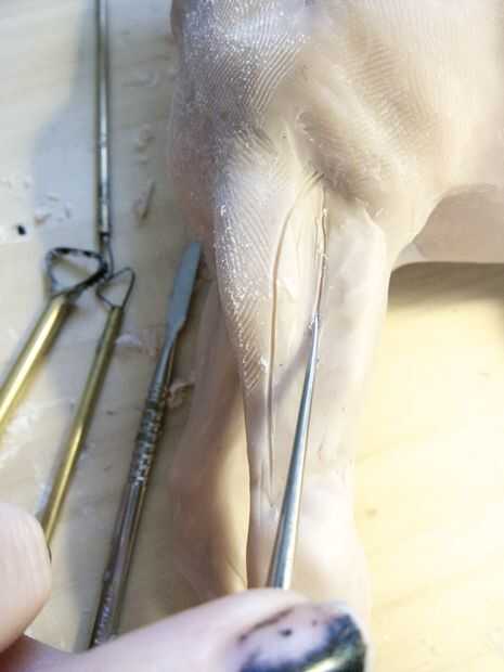 Este paso es más bien una constante técnica de dibujo las separaciones entre los músculos, dibujo donde marcadores del cuerpo (en un ser humano, esto sería como el ombligo, hueso pélvico, muesca del suprasternal, etc.) son y el dibujo para recordar a usted de las direcciones o gesto de la escultura. Es importante seguir a tu figura para que estos detalles y marcadores principales no se pierden. Yo uso una herramienta dental con punta o un cuchillo X-acto para dibujar en mis piezas.