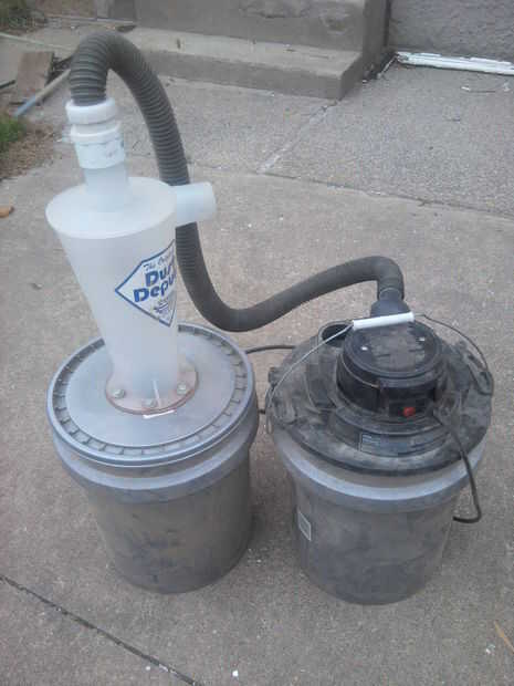 Otra cosa muy importante que al usar estas dos herramientas es una especie de colección de polvo. La afeitadora de la pintura y la lijadora vinieron con mangueras de 10 pies para conectar a una aspiradora. La afeitadora de pintura producirá un montón de virutas de madera /paint y la lijadora arrojará una gran cantidad de polvo. Para manejar esto obtuve un Polvo adjunto al ciclón DIY de un cubo de 5 galones, luego al de una aspiradora de cubo. Esto resultó para ser una gran combinación y se pueden ver algunas de las fotos donde recogió un balde entero lleno de virutas y serrín. El diputado de polvo esto mantuvo fuera de la cubeta aspiradora y casi nada pero el polvo más fino es el filtro de vacío. Pude hacer un de 15 pies por 5 pies sección de revestimiento, tanto afeitado y lijado, antes de que el ciclón relleno para arriba. En ese momento me descarga el cubo de virutas y también sacudir el filtro de tela en el vacío.