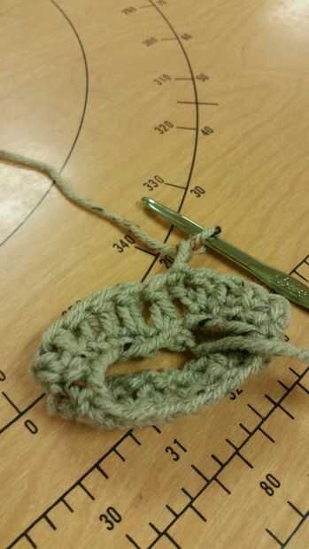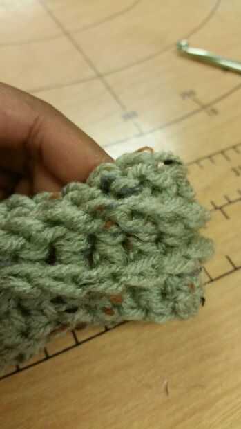Fila: 17-22 frente poste doble crochet en cada punto, sl st a, lazo de color cuatro (marrón oscuro)